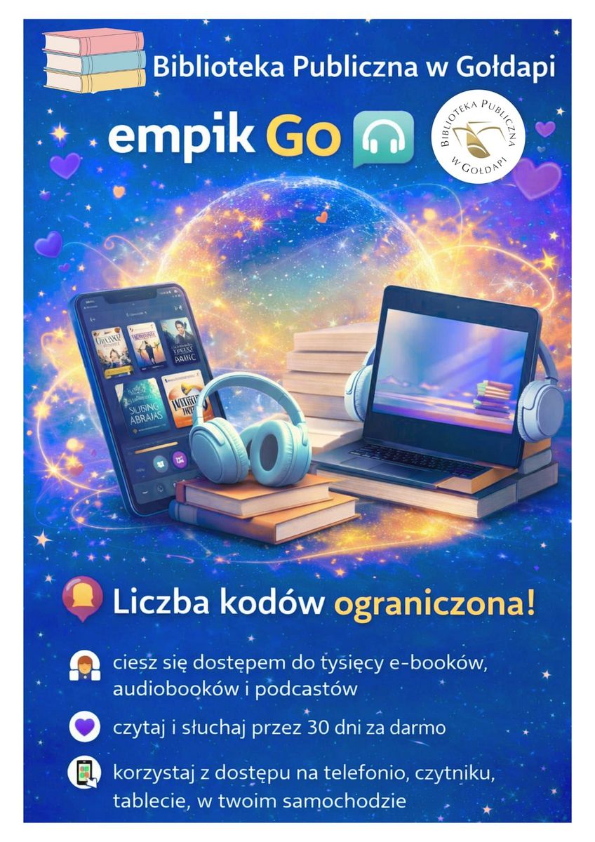 Biblioteka Publiczna w Gołdapi oferuje swoim czytelnikom darmowy dostęp do aplikacji Empik Go, w której znajdziesz aż 195 000 e-booków, audiobooków, podcastów i słuchowisk – bez limitu stron!