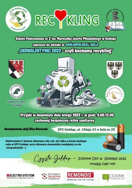 Zapraszamy wszystkich mieszkańców Gołdapi i okolic do udziału w Ogólnopolskiej Akcji Edukacyjnej EkoWalentynki 2022. Lokalnym koordynatorem jest Alina Oleszczuk i Klub Naszej Ziemi Przyjaciele Przyrody działający przy Szkoła Podstawowa Nr 2 im. Marszałka Józefa Piłsudskiego w Gołdapi.