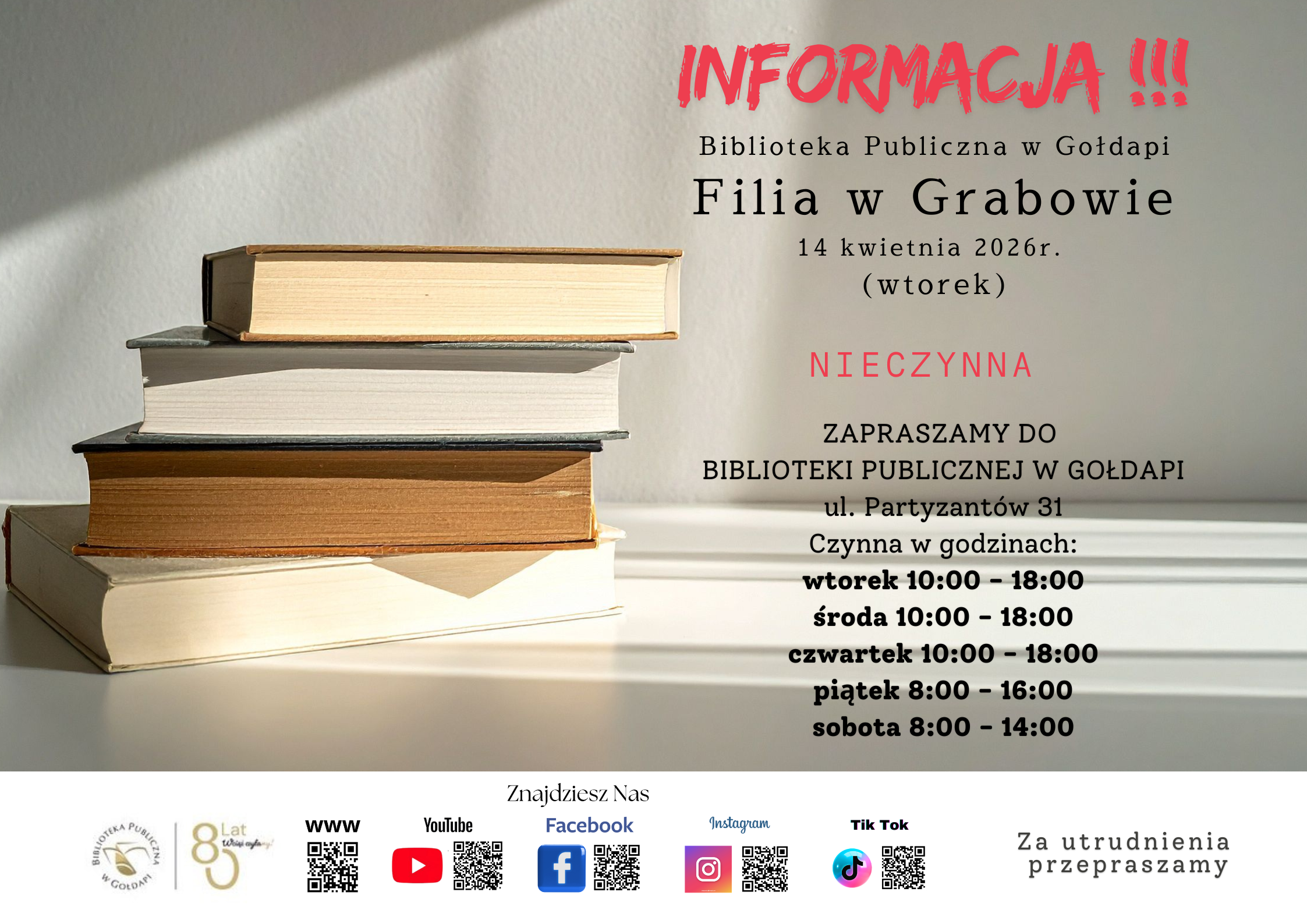 Informujemy, że w dniu 14 kwietnia 2026r. Filia w Grabowie będzie nieczynna. Za utrudnienia przepraszamy i zapraszamy do skorzystania z naszych usług w pozostałe dni.