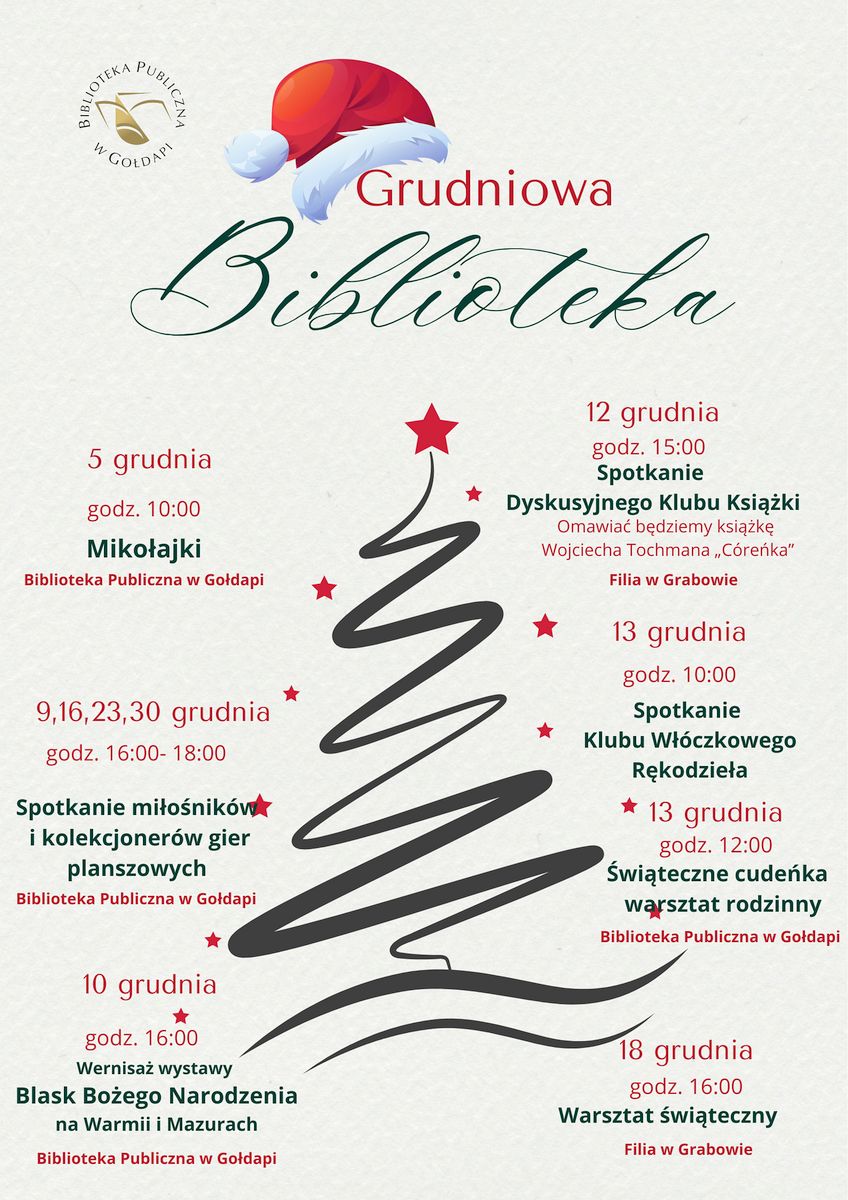 Grudzień w naszej bibliotece zapowiada się pełen świątecznego klimatu, literackich odkryć i ciekawych inicjatyw. Już 5 grudnia odwiedzi nas Mikołaj wprowadzając wszystkich w radosny, zimowy nastrój i zachęcając do sięgania po świąteczne książki, które czekają na Was na naszych półkach. W każdy wtorek zapraszamy na popołudnia z grami planszowymi — to doskonała okazja, by spędzić czas wśród książek, w rodzinnej atmosferze i przy wspólnej zabawie. Świąteczny klimat dopełni wernisaż wystawy poświęconej tradycjom bożonarodzeniowym, który pozwoli odkryć historie i zwyczaje będące częścią naszej kultury. W grudniowym programie nie zabraknie także literackich rozmów podczas Dyskusyjnego Klubu Książki gdzie porozmawiamy o wartościach ukrytych w zimowych lekturach. Dodatkowo podczas twórczych warsztatów wykonamy wyjątkowe świąteczne ozdoby, inspirując się bajkami i książkowymi motywami. Przed nami miesiąc pełen ciepła, książkowych inspiracji i wyjątkowych spotkań — idealny, by zanurzyć się w magii literatury i wspólnie celebrować świąteczny czas.