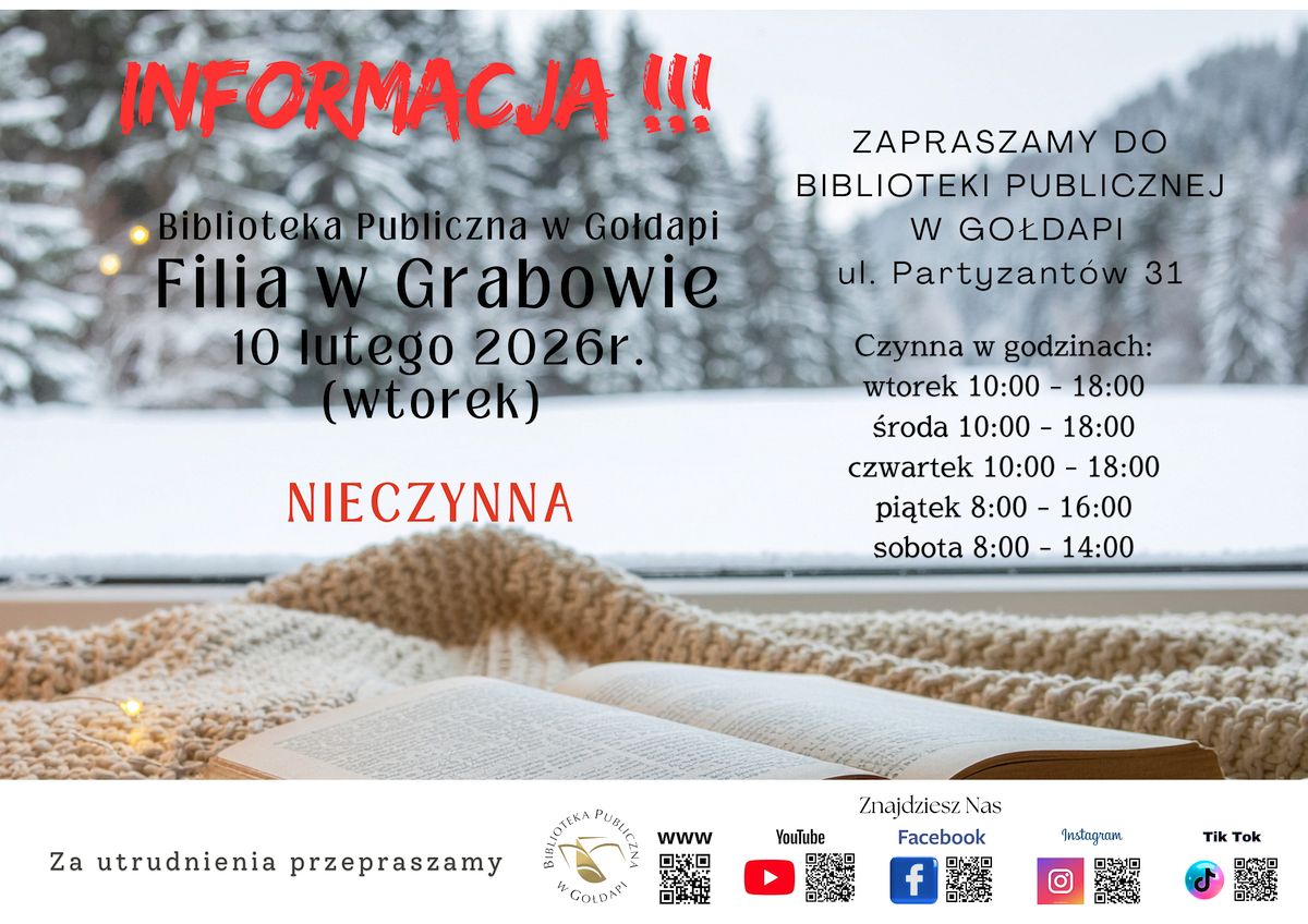 Uprzejmie informujemy, że Filia w Grabowie w dniu 10 lutego 2026 r. będzie nieczynna. Dziękujemy za wyrozumiałość i zapraszamy w kolejnych dniach.