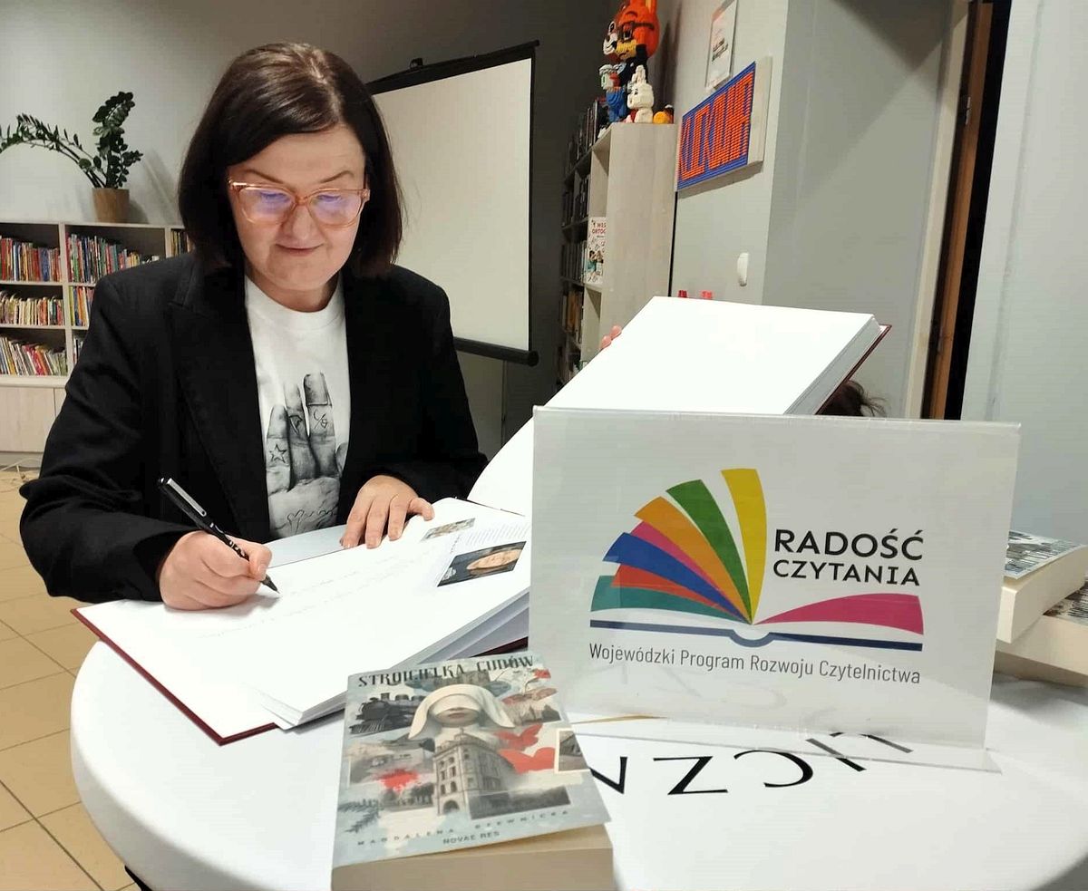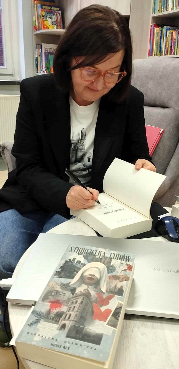 „Stroicielka cudów”, której akcja toczy się na pograniczu polsko-litewsko-białoruskim w latach 20. XX wieku, to powieść łącząca elementy historii, obyczajowości i kryminału. Autorka w barwny sposób opowiadała o pracy nad książką, inspiracjach i znaczeniu lokalnego dziedzictwa w budowaniu literackiego świata. Po prezentacji powieści przyszedł czas na rozmowy przy książce – uczestnicy mieli okazję porozmawiać z panią Magdą, zadać pytania i zdobyć autograf.