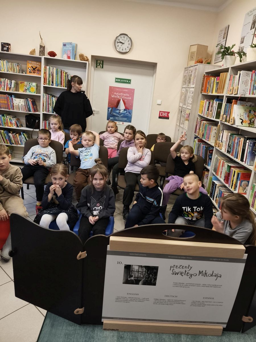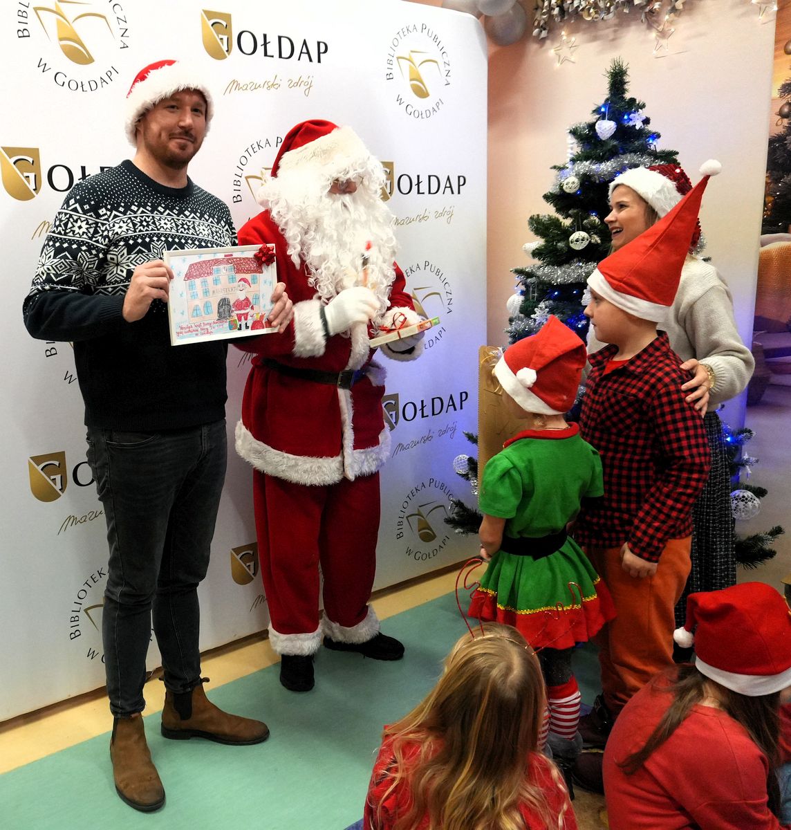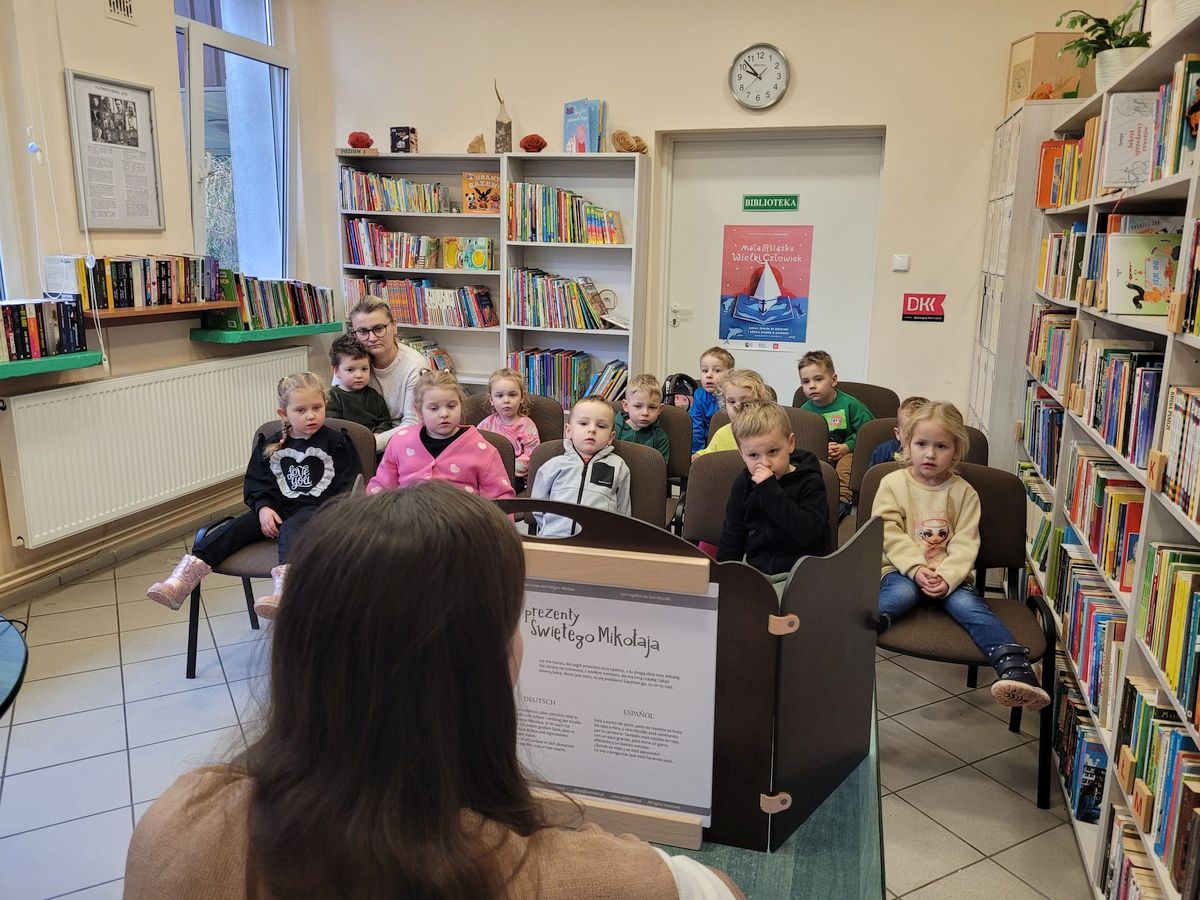 W Bibliotece Publicznej w Gołdapi odbyło się „Spotkanie z Mikołajem”, w którym udział wzięły dzieci ze Szkoły Podstawowej nr 3 im. Tadeusza Kościuszki w Gołdapi oraz Szkoły Podstawowej nr 5 im. Noblistów Polskich w Gołdapi. Już od pierwszych chwil można było poczuć wyjątkowy nastrój nadchodzących mikołajek – dzięki specjalnie przygotowanej na ten dzień świątecznej komnacie stworzonej przez pracowników biblioteki. Wypełniona dekoracjami i zimowymi akcentami przestrzeń wprowadziła wszystkich w ciepły, radosny klimat. Uczestników wydarzenia powitała pani Agnieszka Dziobkowska Dyrektor Biblioteki, podkreślając znaczenie wspólnego czytania i spotkań wokół literatury. Następnie dzieci wysłuchały świątecznych opowieści, które odczytali wyjątkowi goście Konrad Kazaniecki Burmistrz Gołdapi oraz pani Agnieszka Tomaszewska-Skoczeń nauczycielka ze Szkoły Podstawowej nr 5 im. Noblistów Polskich w Gołdapi. Ich interpretacje przeniosły najmłodszych w zimowy świat pełen dobroci, marzeń i świątecznego ciepła. Dzieci przygotowały również niespodziankę – wspólnie zaśpiewały mikołajowi świąteczne piosenki, które zostały nagrodzone szerokim uśmiechem i gromkimi brawami. Radość najmłodszych była najpiękniejszym dowodem na to, jak wyjątkowe było to spotkanie. W tym samym czasie świąteczny nastrój zawitał także do Filii w Grabowie, którą odwiedziły dzieci ze Szkoły Podstawowej im. Michała Kajki w Grabowie. Tam najmłodsi poznali opowieść z teatrzyku kamishibai przedstawiającą przypadkowe spotkanie Gwiazdora ze Świętym Mikołajem. Dzieci z ogromnym zainteresowaniem śledziły kolejne ilustracje papierowego teatru, chętnie odpowiadały na pytania i dzieliły się własnymi mikołajkowymi doświadczeniami.