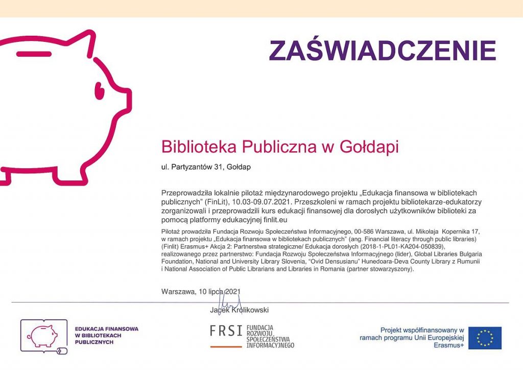 Z przyjemnością informujemy, że nasza biblioteka otrzymała dzisiaj miłą niespodziankę w postaci zaświadczenia za przeprowadzenie lokalnie pilotażu międzynarodowego projektu „Edukacja finansowa w bibliotekach publicznych” (FinLit), 10.03-09.07.2021. pilotaż prowadziła Fundacja Rozwoju Społeczeństwa Informacyjnego.