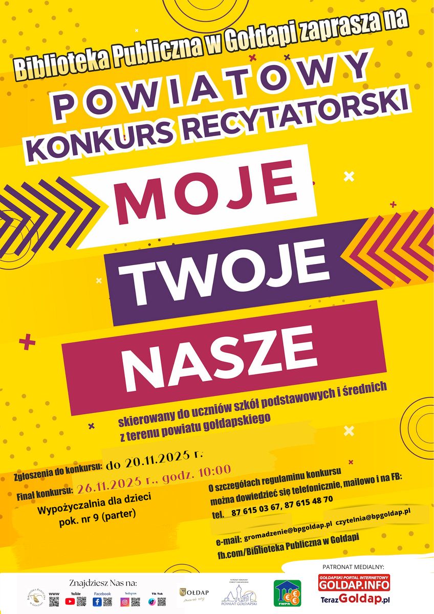 Powiatowy Konkurs Recytatorski „Moje, Twoje, Nasze” skierowany do uczniów w wieku od 10 lat z terenu powiatu gołdapskiego na stałe wpisał się w kalendarz wydarzeń Biblioteki Publicznej w Gołdapi. Jego celem jest kształtowanie wrażliwości na słowo pisane współczesnych poetów Warmii, Mazur i Suwalszczyzny.