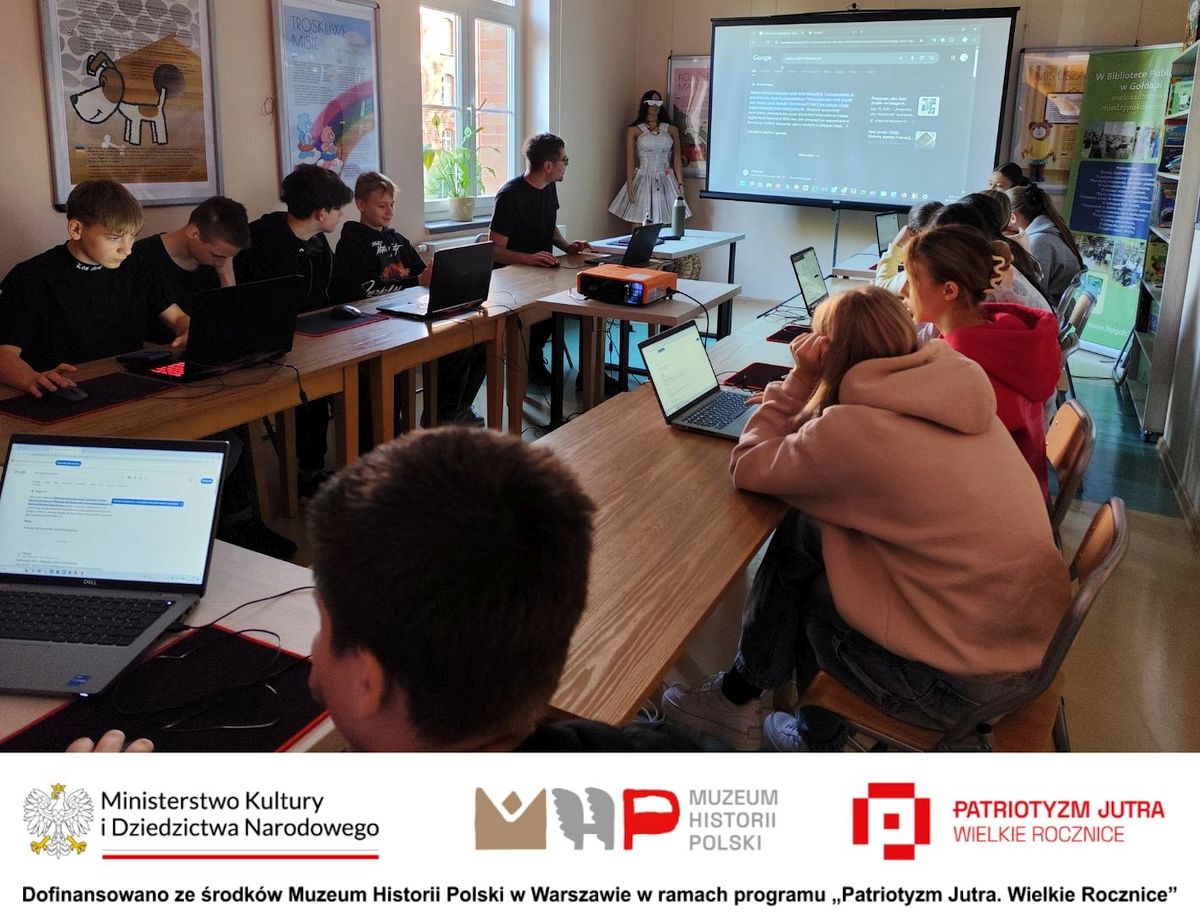 Podczas warsztatów „Od Matejki po Mickiewicza – Hołd Pruski w kulturze” młodzież odkrywała tajemnice obrazu „Hołd pruski” Jana Matejki – tym razem z nowoczesnej, kreatywnej perspektywy! 🔍✨ Uczestnicy uczyli się, jak mądrze wyszukiwać informacje w sieci, poznawali tło historyczne wydarzenia, twórczość Matejki i symbolikę jego dzieła. A potem… dali się ponieść wyobraźni! 💡
