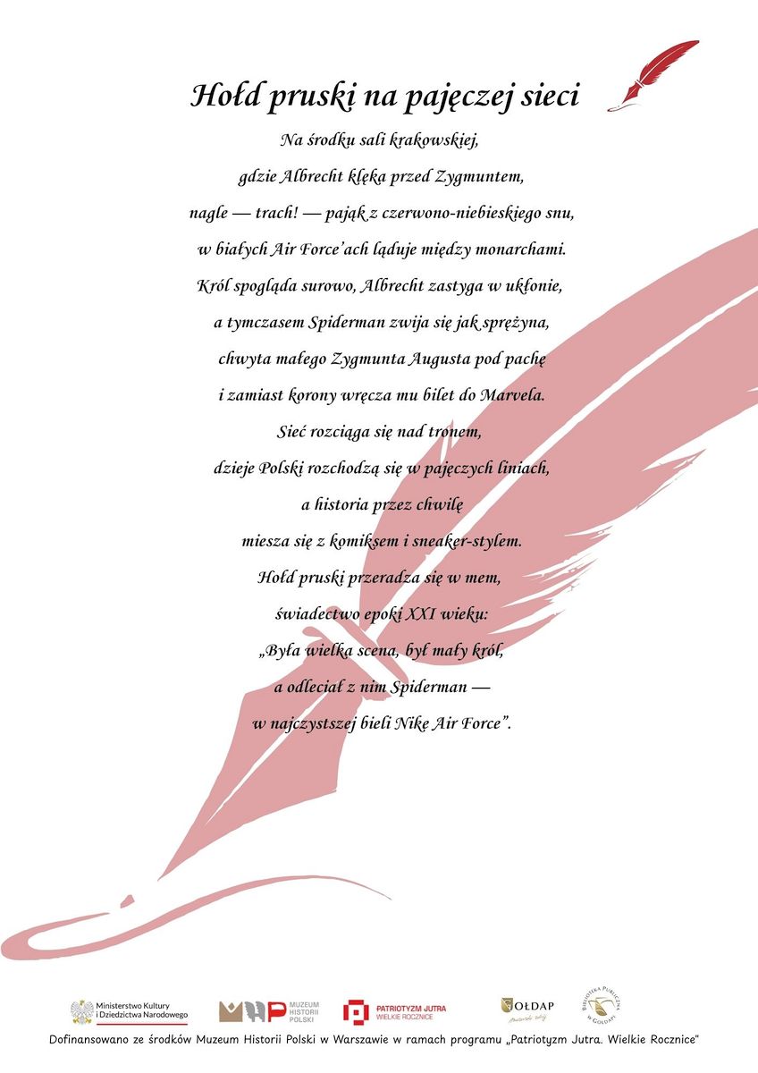 Za pomocą narzędzi AI ożywiali postacie z obrazu, rozmawiali z historycznymi bohaterami, tworzyli alternatywne wersje wydarzeń („Co by było, gdyby Albrecht nie ukląkł?”), a także pisali własne wiersze, tweety historyczne, memy i nagłówki prasowe inspirowane „Hołdem pruskim”. 🖋️🧠 Nie zabrakło też ilustracji do stworzonych utworów, rozmów o kulturze, literaturze i patriotyzmie. To była niezwykła lekcja historii, w której przeszłość spotkała się z nowoczesnością – a uczestnicy stali się twórcami własnych interpretacji. 💬 Warsztaty są częścią naszego cyklu spotkań łączących sztukę, literaturę i refleksję historyczną. Dziękujemy wszystkim uczestnikom za pasję, pomysły i zaangażowanie! ❤️