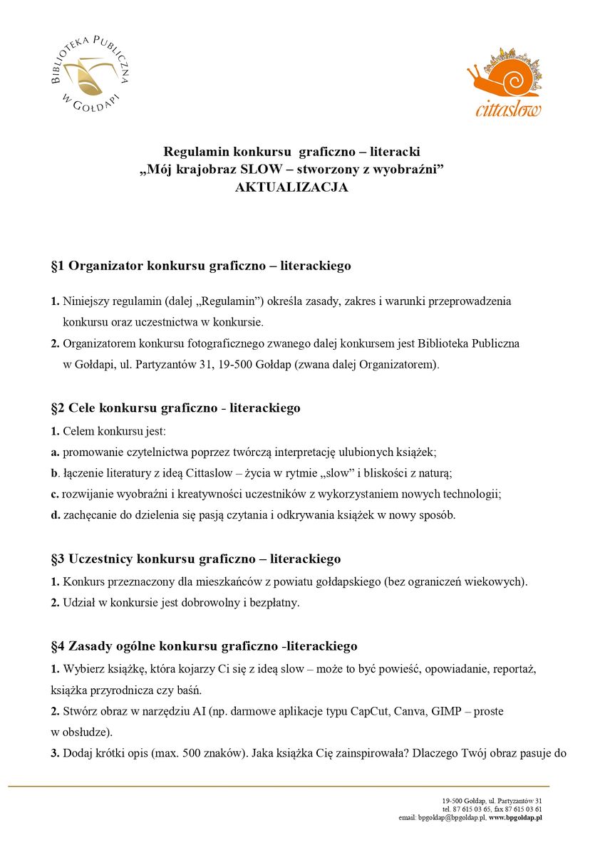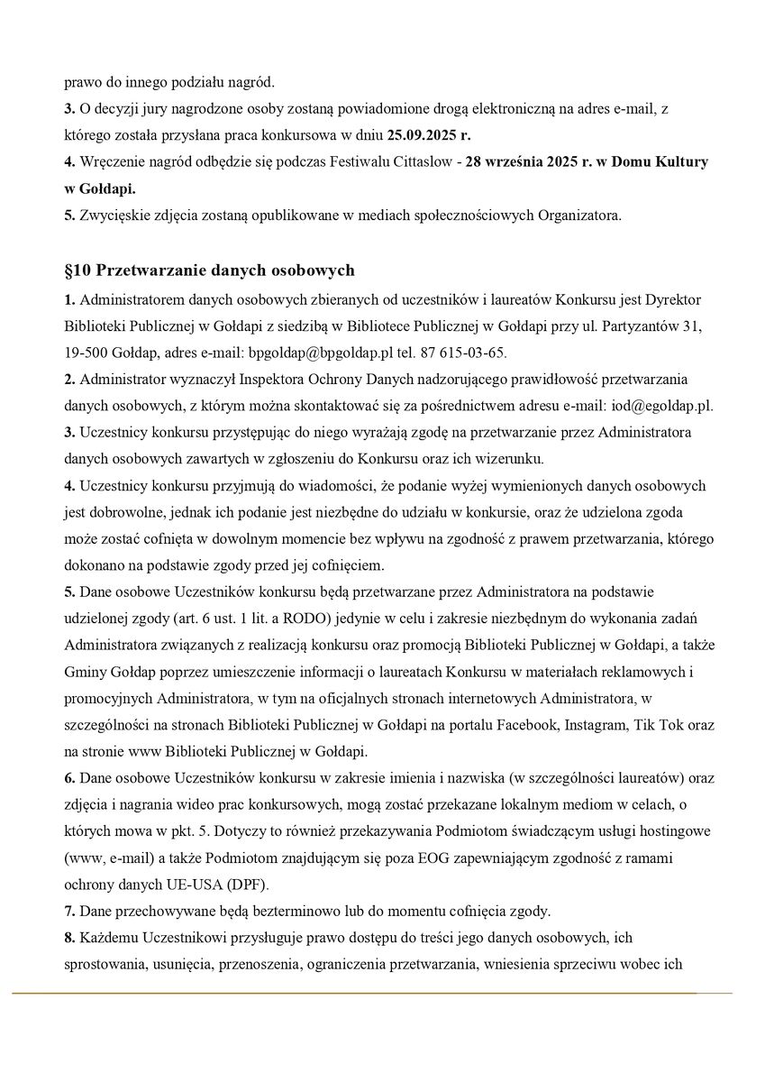 – zapoznałem/am się z Regulaminem Konkursu dostępnym na stronie internetowej Biblioteki Publicznej w Gołdapi (w tym z zasadami przetwarzania danych osobowych i regulacjami dotyczącymi praw autorskich), akceptuję jego treść i zobowiązuję się do jego przestrzegania;