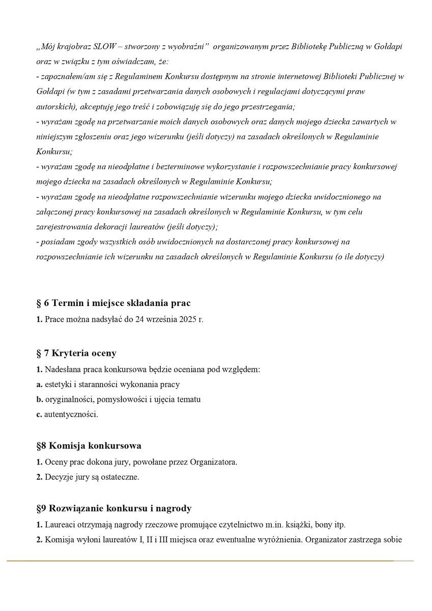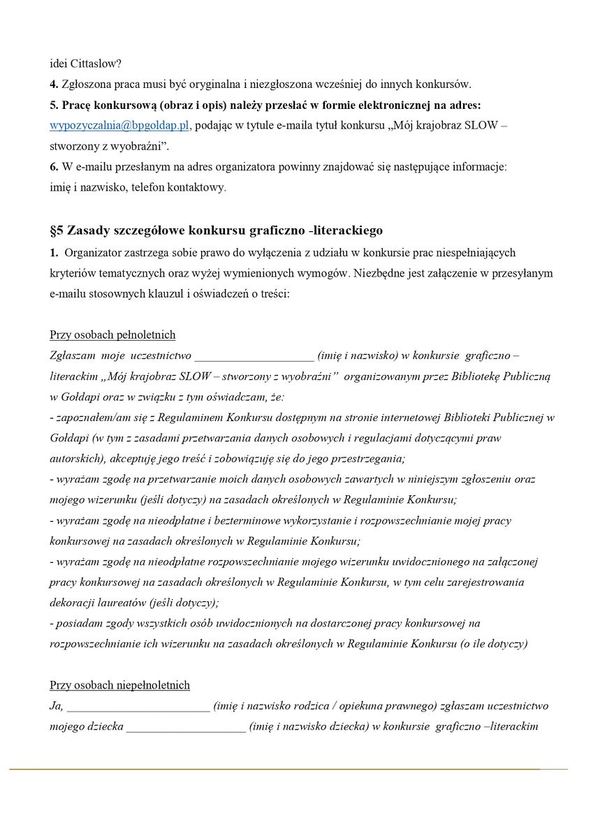 Zgłaszam moje uczestnictwo ____________________ (imię i nazwisko) w konkursie graficzno –literackim „Mój krajobraz SLOW – stworzony z wyobraźni” organizowanym przez Bibliotekę Publiczną w Gołdapi oraz w związku z tym oświadczam, że: