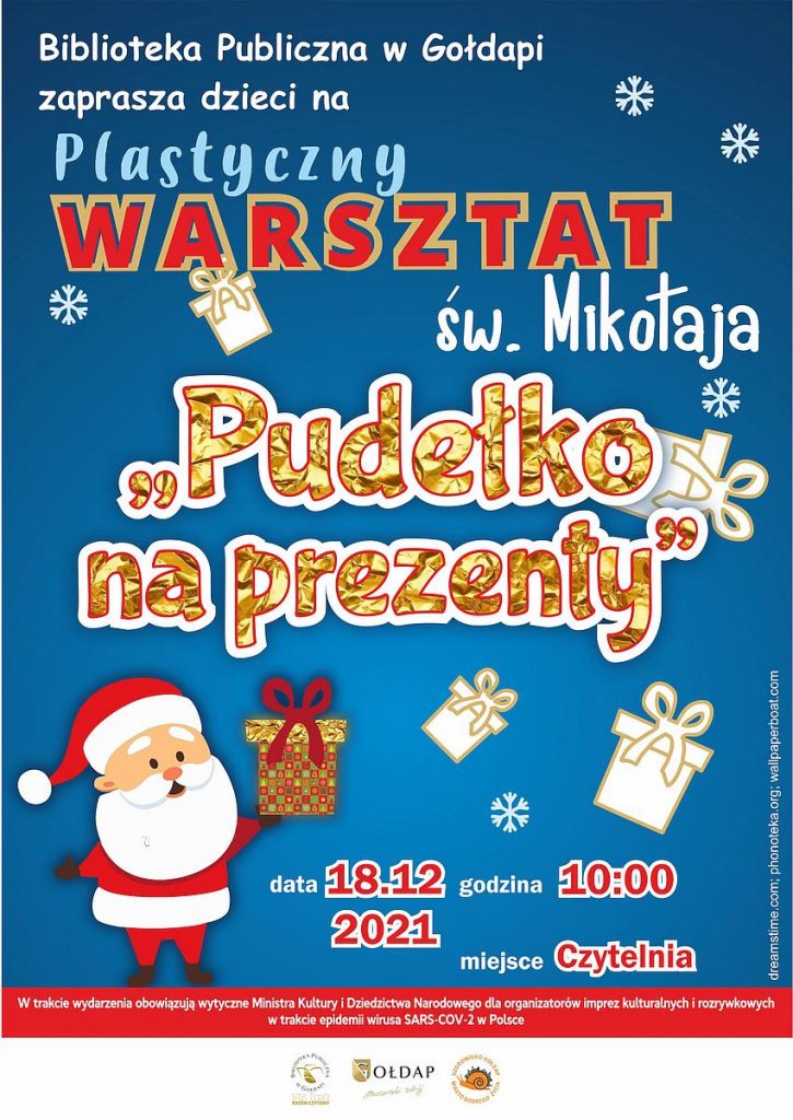 Biblioteka Publiczna w Gołdapi zaprasza dzieci wraz z rodzicami na kolejne sobotnie warsztaty. Tym razem wykonamy „Pudełko na prezenty”, które odbędzie się 18.12.2021 r o godz. 10.00 w Bibliotece Publicznej w Gołdapi. Liczba miejsc ograniczona. Obowiązują bezpłatne wejściówki do odebrania w wypożyczalni dla dzieci w godzinach jej pracy od 11 grudnia.