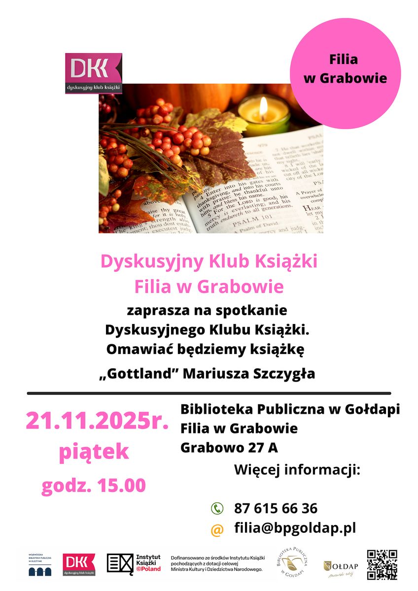 Zapraszamy już jutro (21 listopada 2025 r.) o godz. 15:00 wszystkich miłośników literatury na kolejne spotkanie Dyskusyjnego Klubu Książki, które odbędzie się w Filii w Grabowie.
