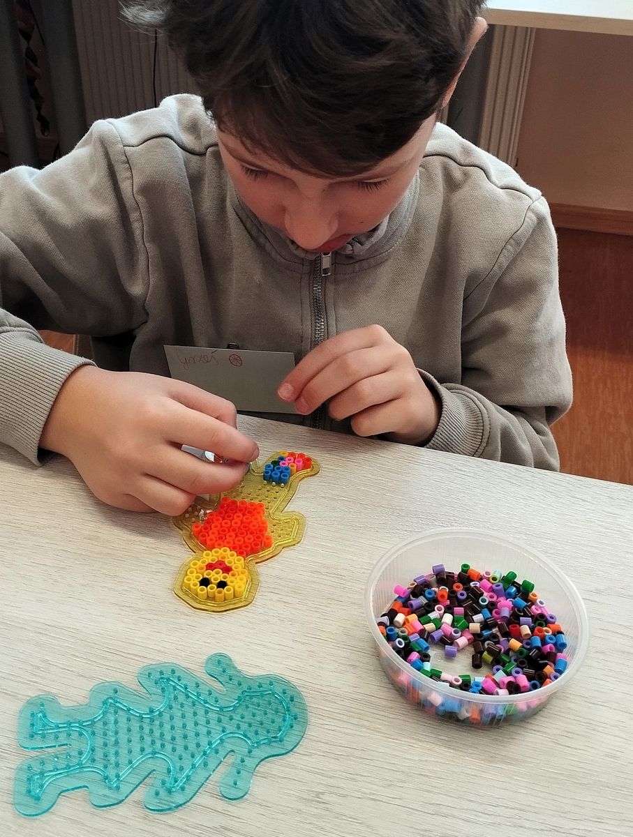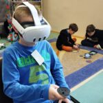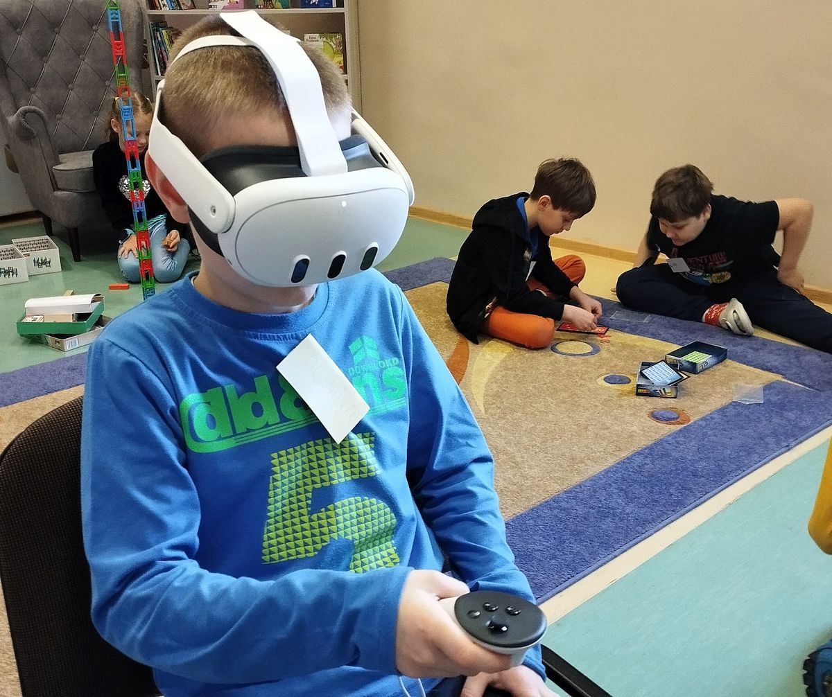 Nie zabrakło także działań twórczych – uczestnicy z dużym zaangażowaniem tworzyli barwne prace z koralików prasowanek, ćwicząc cierpliwość, wyobraźnię i zdolności manualne. Nowoczesnym i niezwykle atrakcyjnym elementem zajęć była zabawa z wykorzystaniem Google VR, która przeniosła dzieci w wirtualny świat pełen ciekawych doświadczeń.