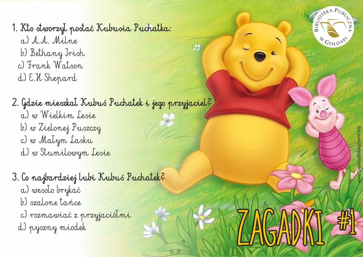 Z tej okazji Biblioteka Publiczna w Gołdapi przygotowała pięciodniową zabawę dla fanów Kubusia Puchatka. Od 14 stycznia publikujemy na naszym profilu Facebooka posty z krótkimi zadania. Zapraszamy do udziału w zabawie i czekamy na Wasze odpowiedzi w komentarzach pod postami.