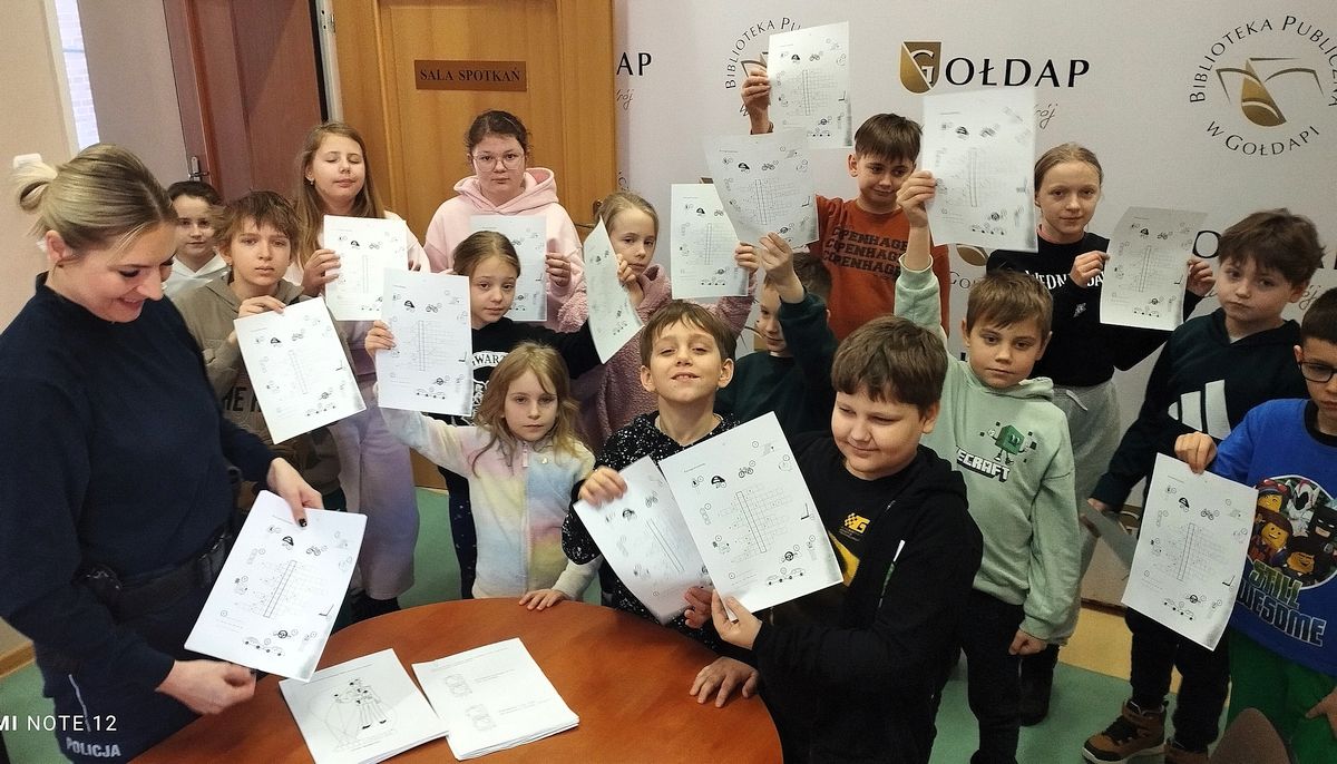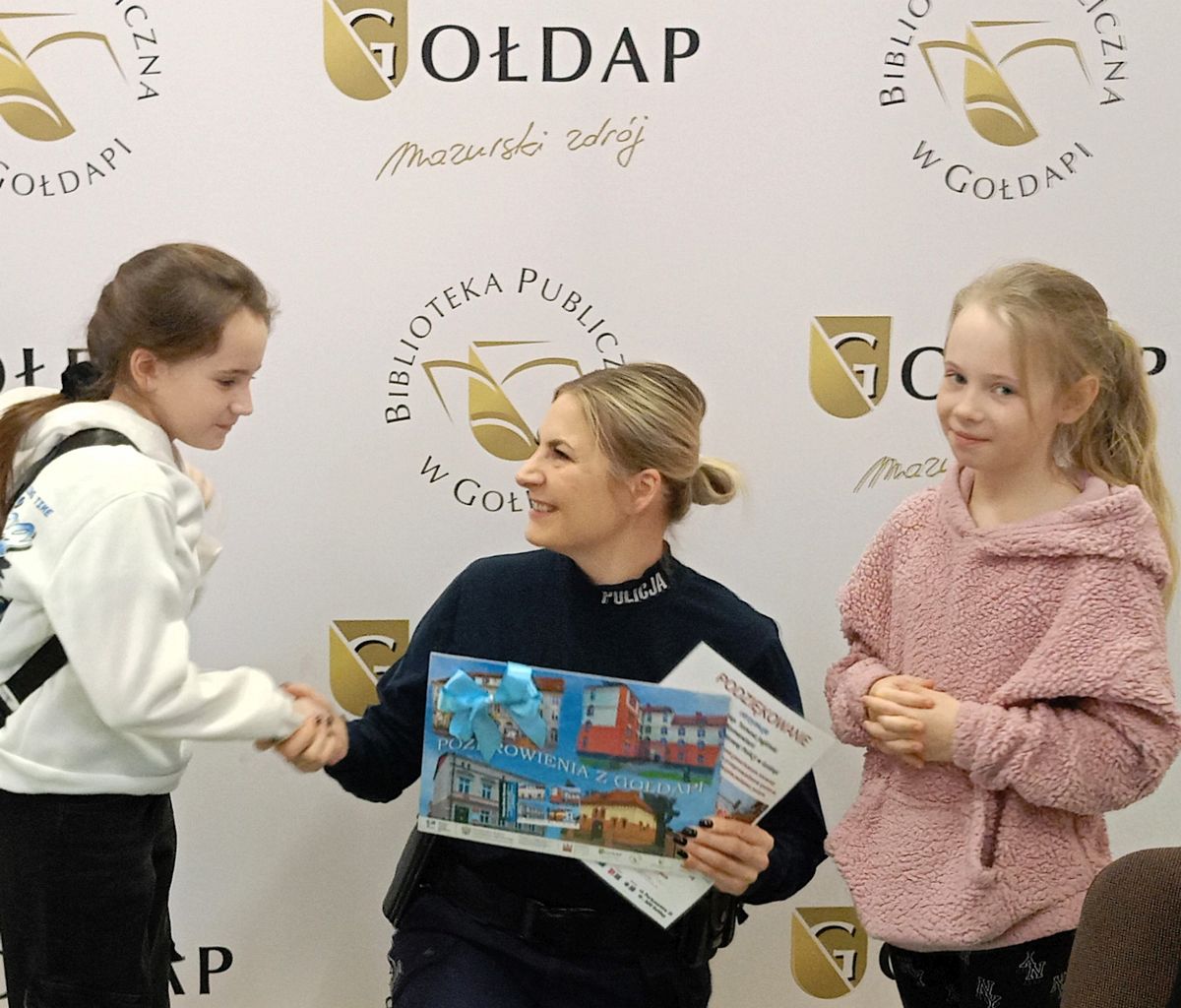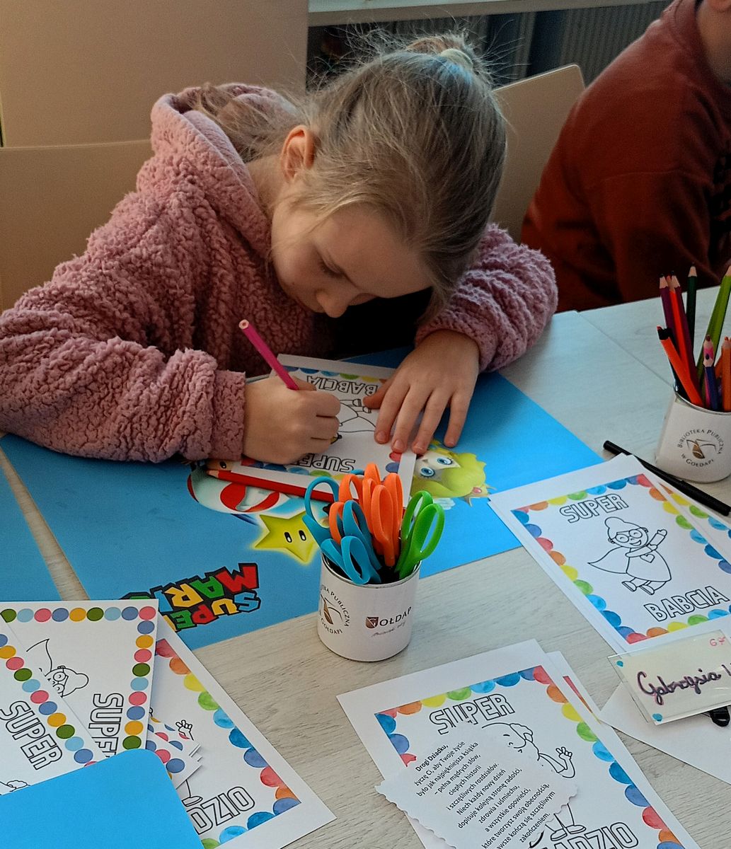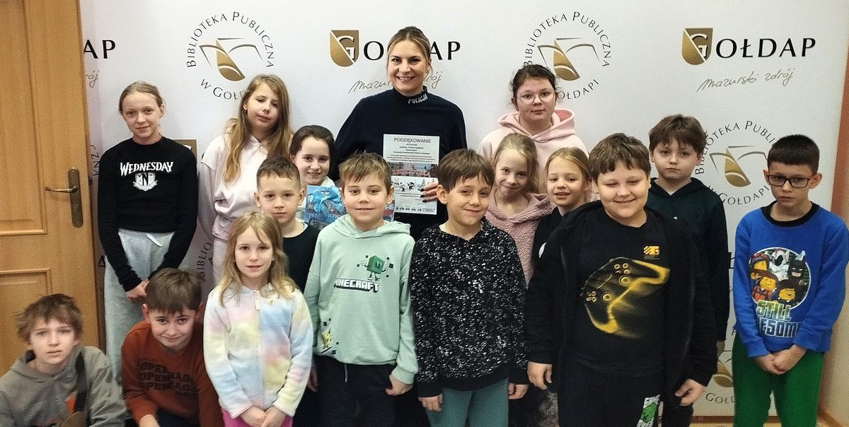 Równocześnie rozpoczęliśmy feryjne zajęcia w bibliotece. Naszym gościem była funkcjonariuszka Komendy Powiatowej Policji w Gołdapi, która rozmawiała z dziećmi o bezpiecznym spędzaniu ferii zimowych. Podczas spotkania dzieci wysłuchały fragmentu książeczki „Zimowe zabawy”, który zachęcał do odpowiedzialnego korzystania z zimowych atrakcji. W ramach podziękowania najmłodsi wręczyli laurkę, a w zamian otrzymali kolorowanki związane z zasadami bezpieczeństwa. Po części edukacyjnej dzieci z entuzjazmem tworzyły laurki „Super Dziadzio” i „Super Babcia”, a następnie wspólnie bawiły się przy grach planszowych oraz budowie konstrukcji z klocków LEGO.